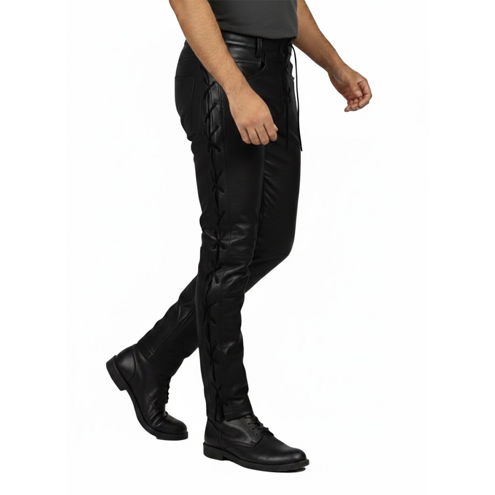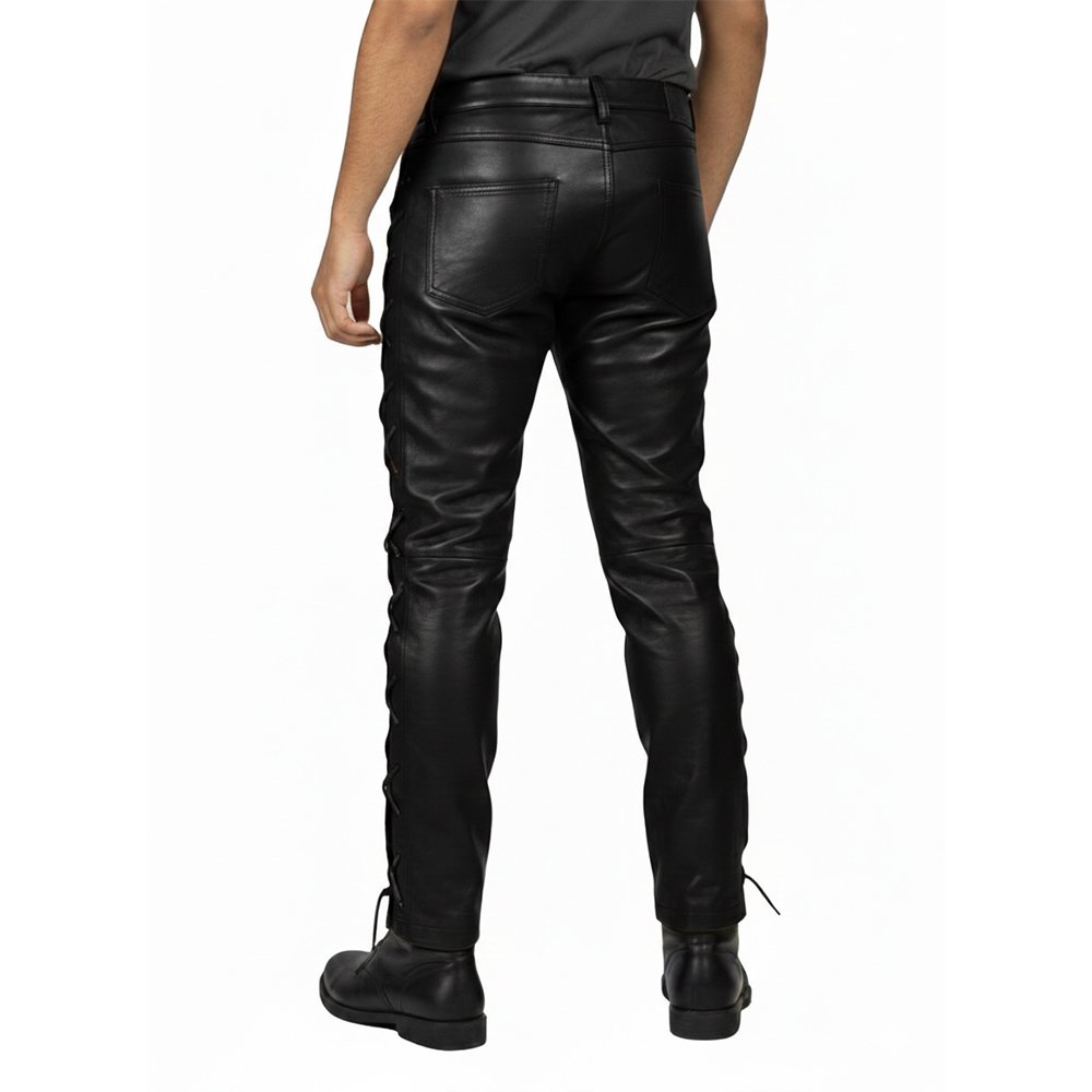 Make a strong style statement with these Black Leather Pants with Matching Side Laces. Designed for men who appreciate bold fashion, these pants combine classic leather appeal with modern edge.
