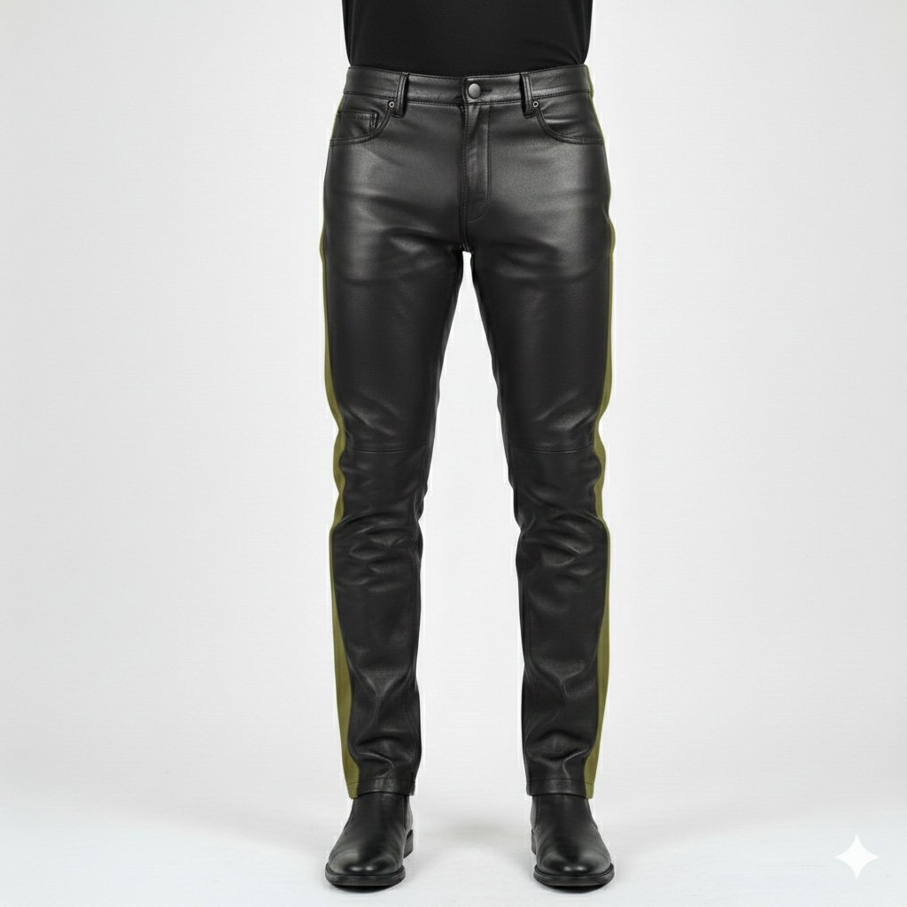 Upgrade your wardrobe with these striking Black Leather Pants with Olive Green Side Stripe. They are made from premium genuine leather. The leather feels soft yet sturdy. Every pair is built to last. The black base gives a classic, timeless look. A bright Olive green side stripe runs along each leg. It adds a sporty, modern edge. The stripe makes these pants stand out in any crowd.