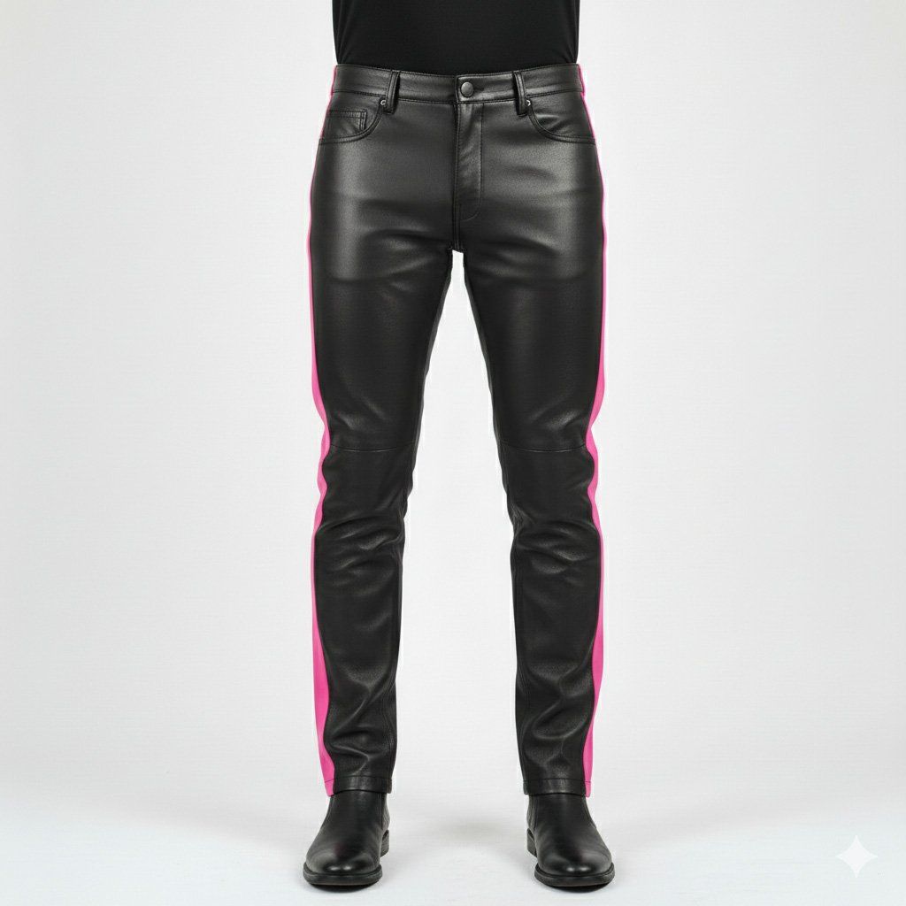 Step up your style with these Black Leather Pants with Pink Side Stripe. They are made from premium genuine leather. The leather is soft but durable. It holds shape and lasts long. The black base gives a sleek, classic look. A bright pink side stripe runs along each leg. It adds a bold, sporty edge. The stripe makes these pants stand out anywhere.
