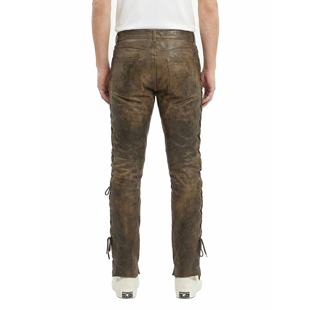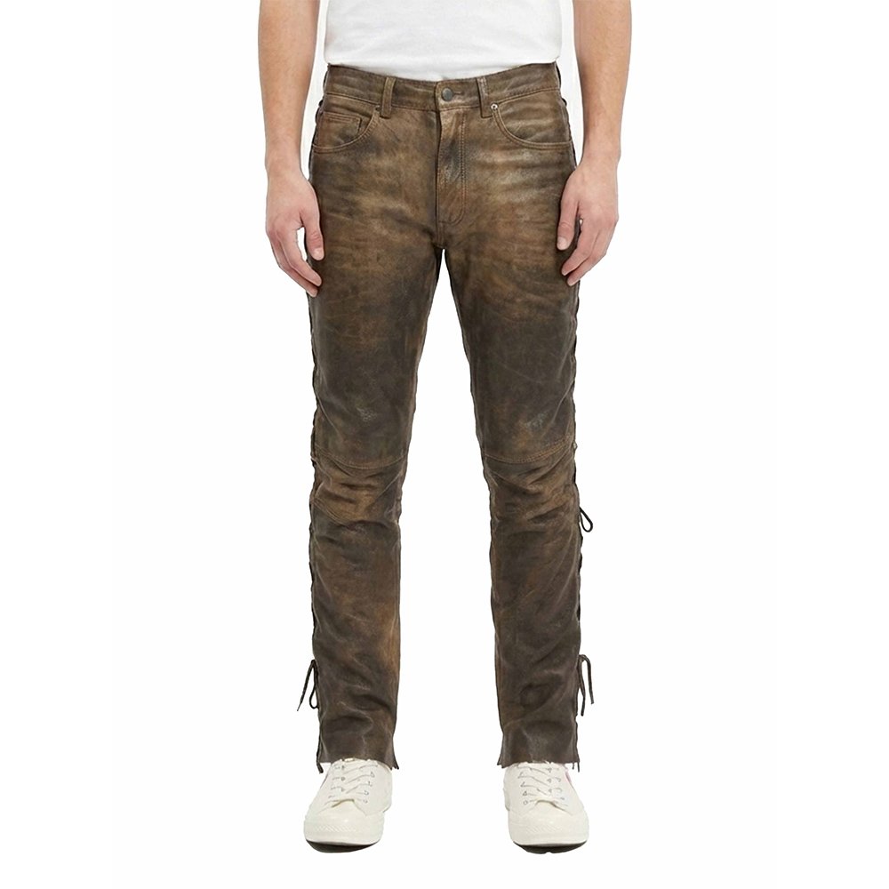 Step into rugged style with our Brown Distressed Leather Pants Laces Up. Raw texture. Vintage finish. Bold attitude. These pants bring classic biker energy with a modern streetwear edge.