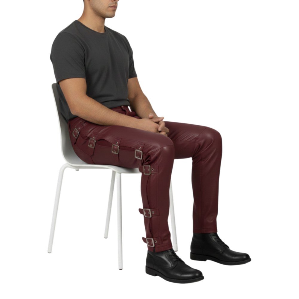 Make a bold fashion statement with these Burgundy Leather Pants with Side Straps. Rich color. Strong design. Confident attitude. These pants combine modern street style with classic biker influence.