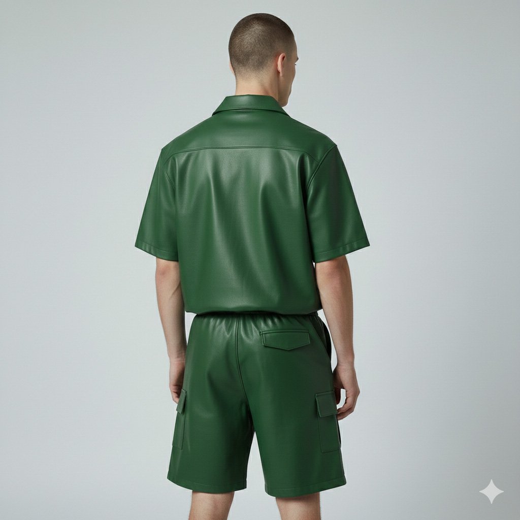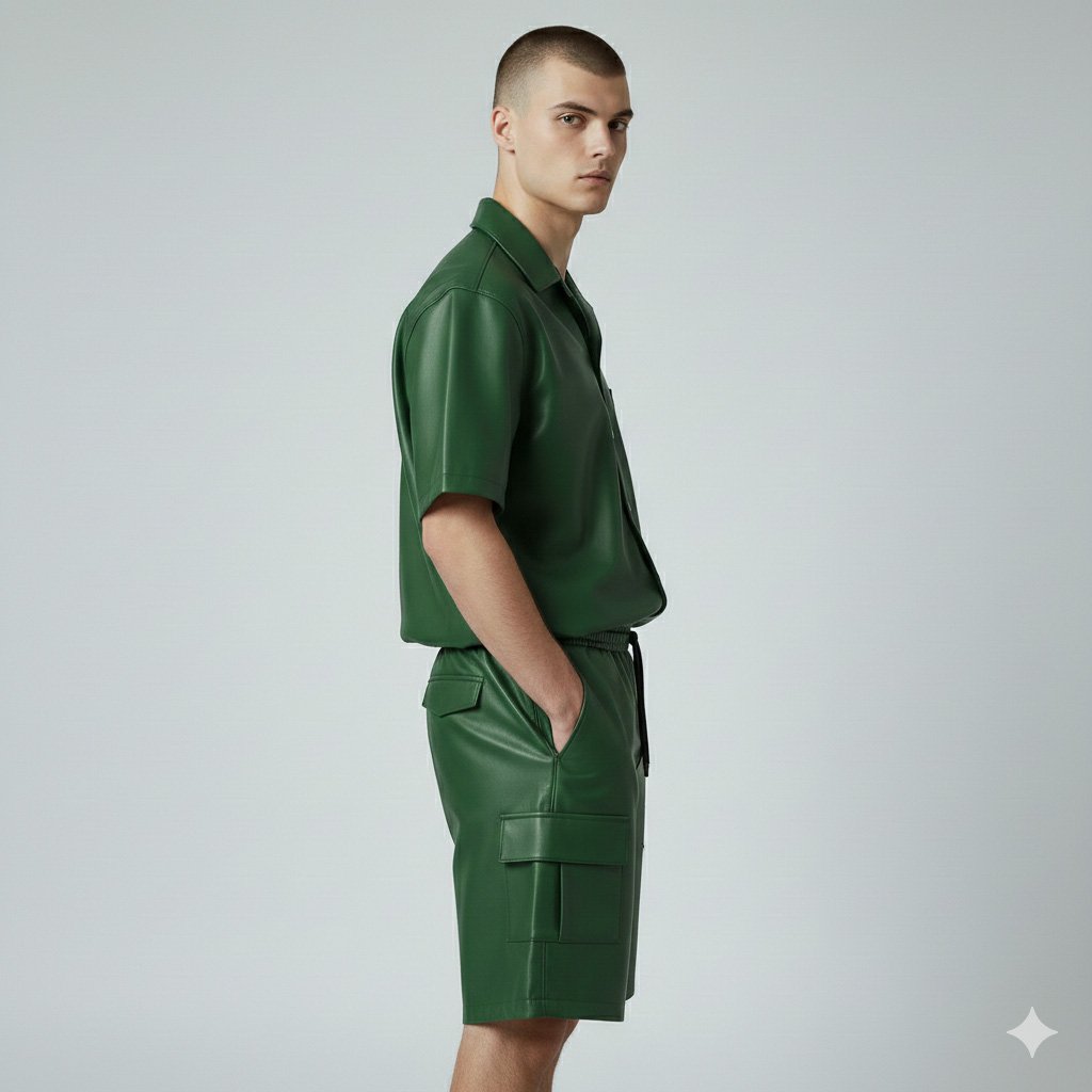 Step into bold style with this Green Leather Shirt & Cargo Shorts Set. Clean design. Strong attitude. Modern streetwear energy. This co-ord outfit delivers confidence and sophistication in one look.