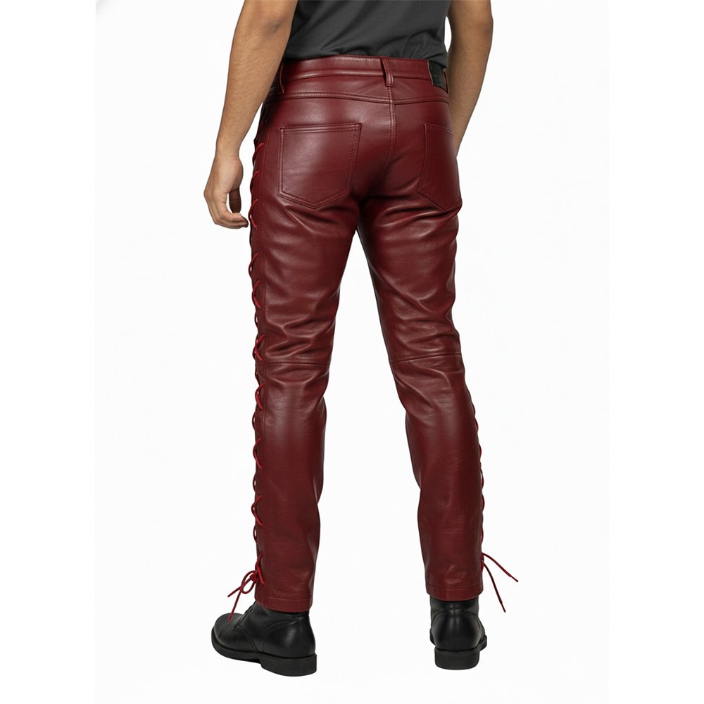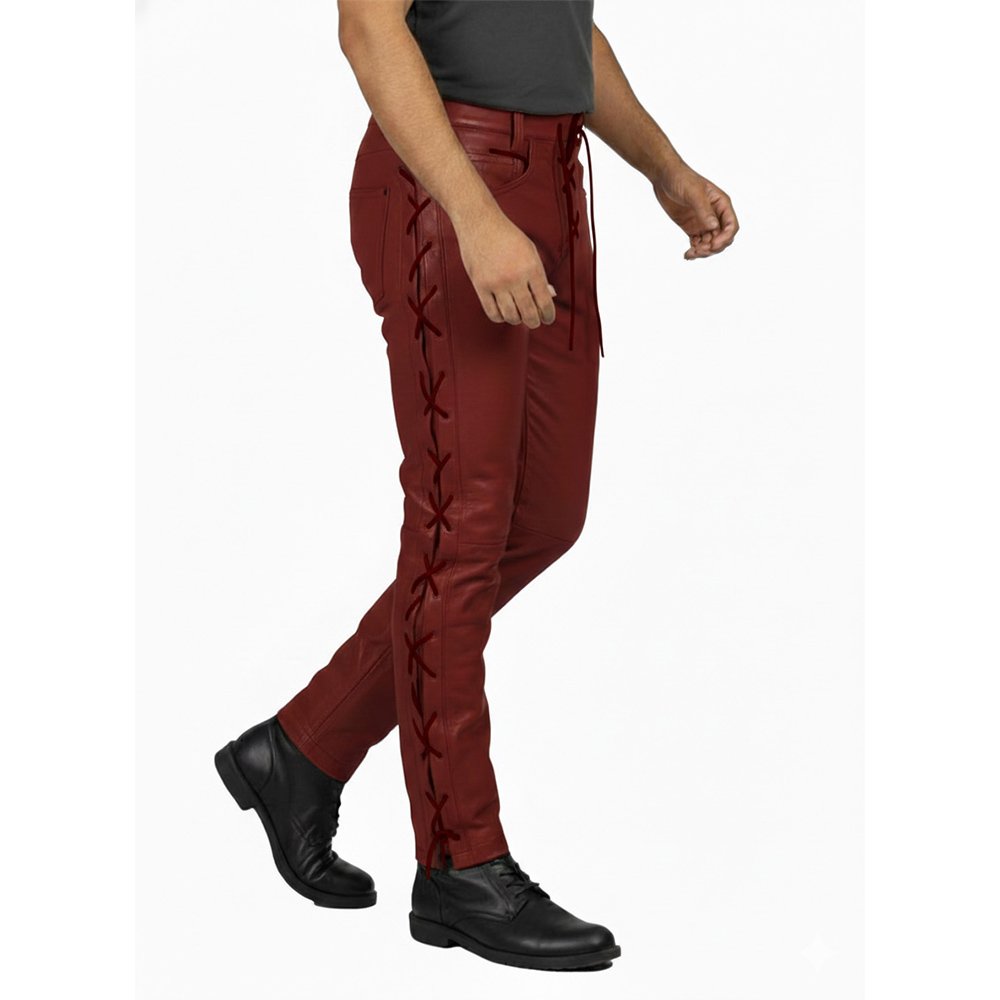 Step into bold fashion with these Maroon Leather Pants with Matching Side Laces. Designed for men who appreciate strong colours and confident style, these pants bring attitude and sophistication together.