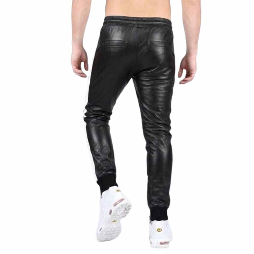 The Men’s Black Leather Jogger Pants with White Side Stripe combine comfort, durability, and bold design. They are ideal for men who want modern leather fashion.