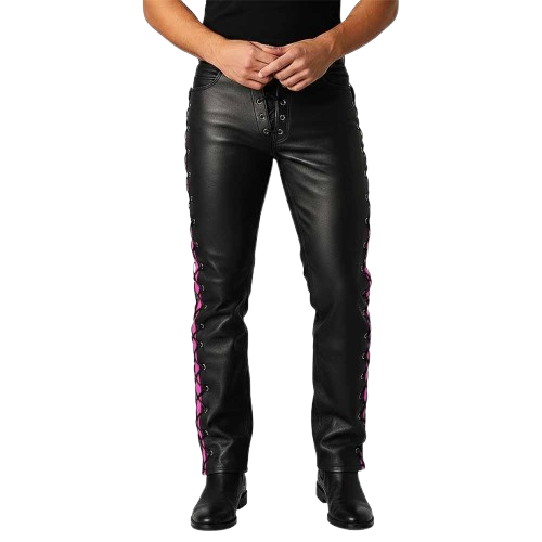 The Men’s Black Leather Pants with Pink Lace-Up Side Panels combine durability, modern design, and premium craftsmanship. They are ideal for men who want leather fashion that stands out.