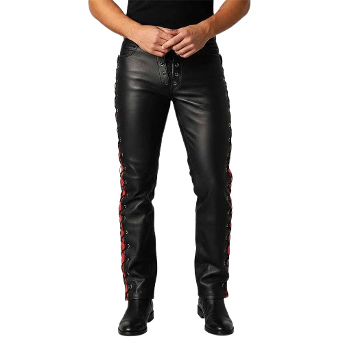 The Men’s Black Leather Pants with Red Lace-Up Side Panels combine durability, standout design, and premium craftsmanship. They are perfect for men who want leather fashion that attracts attention.