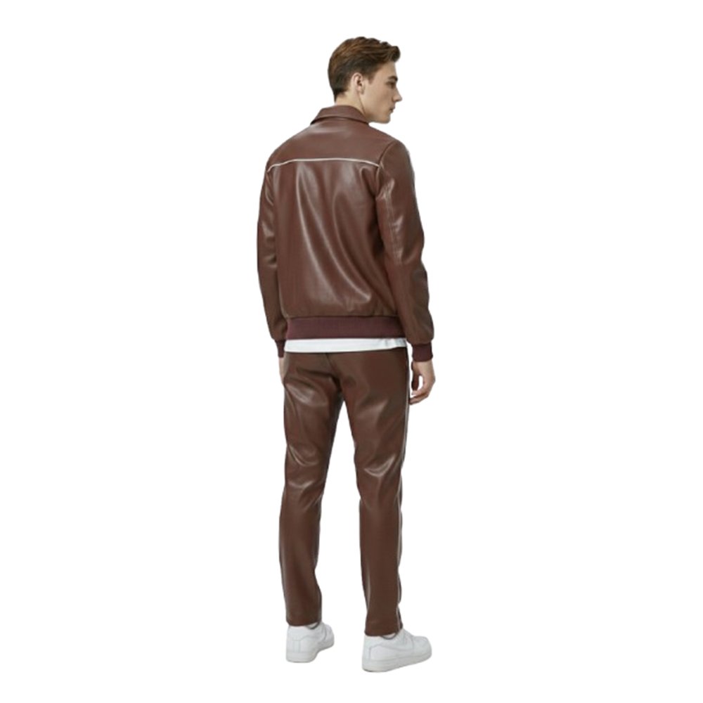The tracksuit includes a premium leather jacket and matching jogger pants. Both pieces feature a smooth brown leather finish accented with contrast white piping details. The piping adds a sporty edge and enhances the overall visual appeal of the outfit.