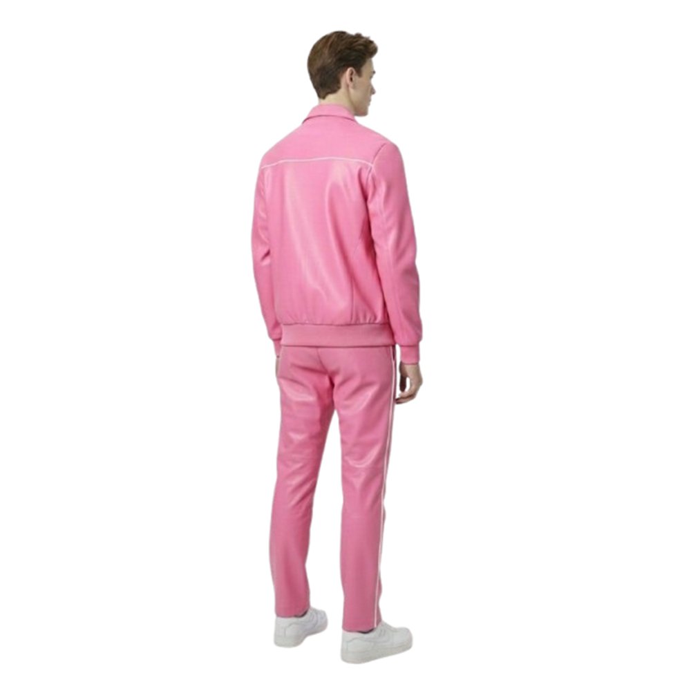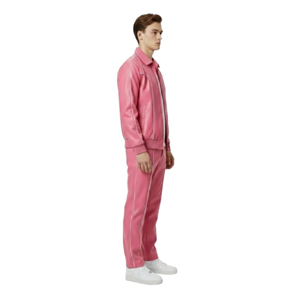 The tracksuit includes a premium leather jacket and matching jogger pants. Both pieces feature a smooth pink leather finish highlighted with contrast white piping details. The piping adds a clean and athletic touch that enhances the overall appearance.