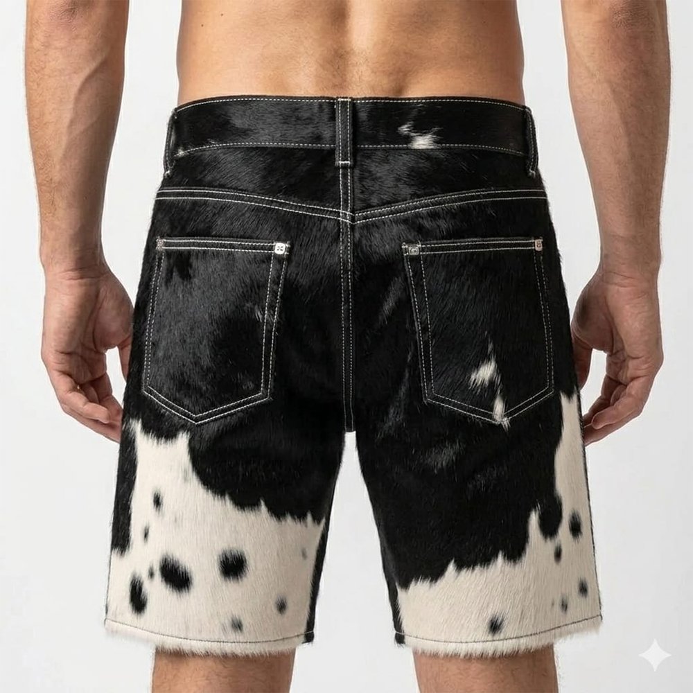 The shorts are crafted from premium hair-on cowhide leather. Each piece features a natural black and white pattern. This natural variation makes every pair unique. No two pieces look exactly the same.