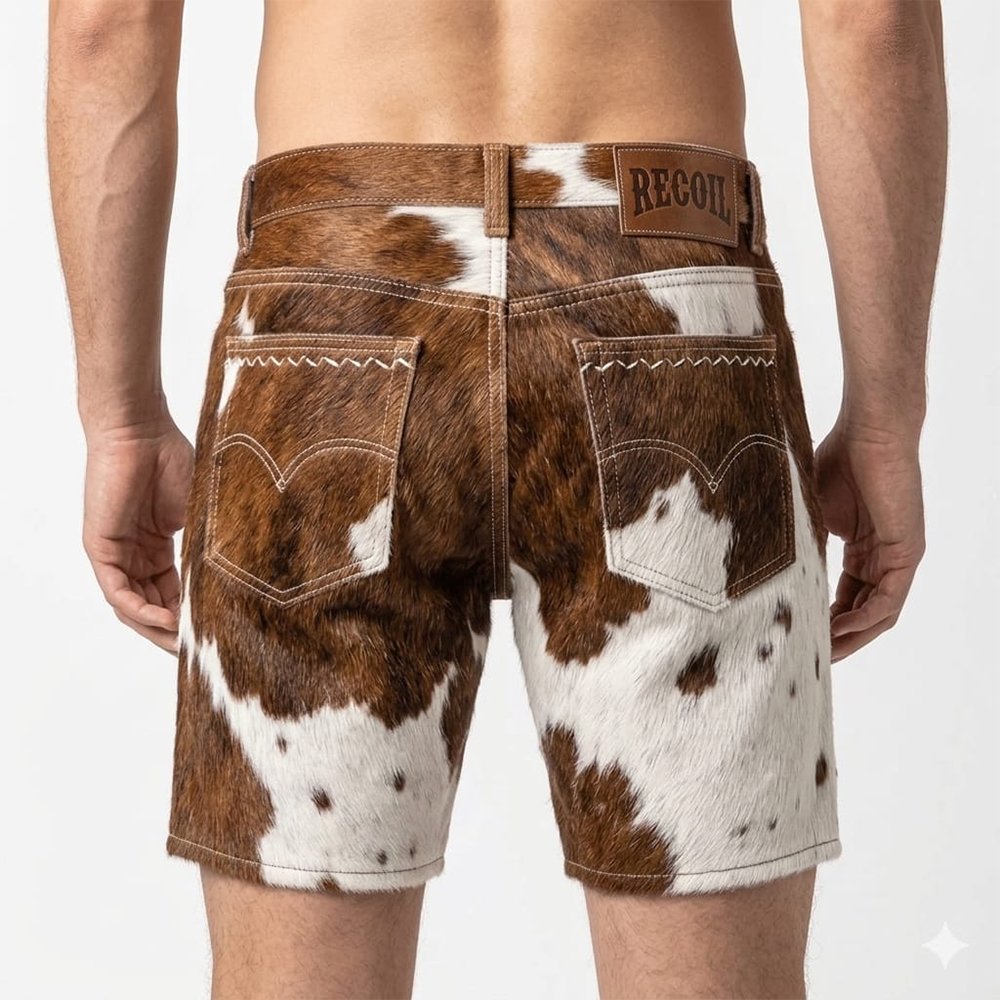The Men’s Premium Golden Brown & White Cowhide Leather Shorts combine durability, natural beauty, and expert craftsmanship. They are ideal for men who want distinctive fashion pieces with a premium feel.