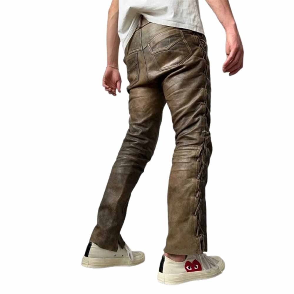 Upgrade your wardrobe with these Vintage Brown Lace-Up Leather Pants. Designed for men who want a bold, rugged, and stylish look. These pants are perfect for making a strong fashion statement.