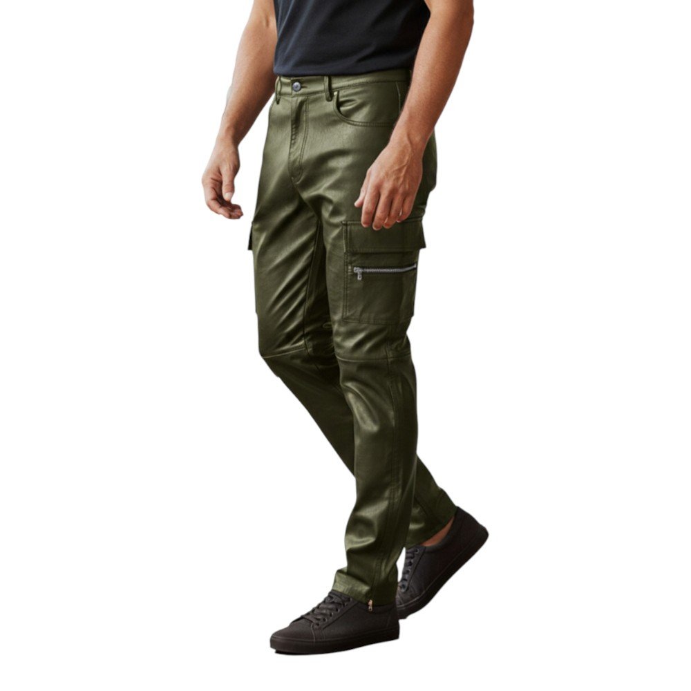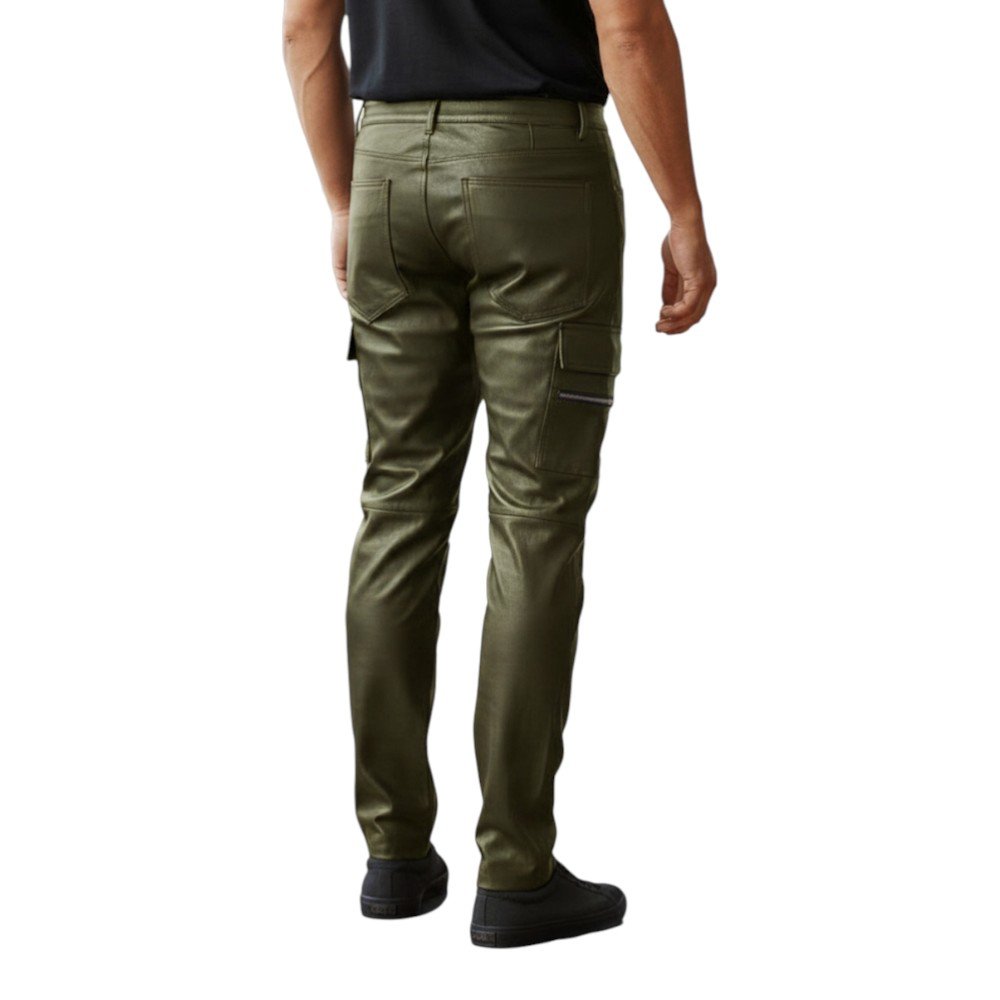 Upgrade your wardrobe with these Olive Green Leather Cargo Pocket Pants. Clean style. Strong design. Modern attitude. These pants combine rugged utility with premium fashion.