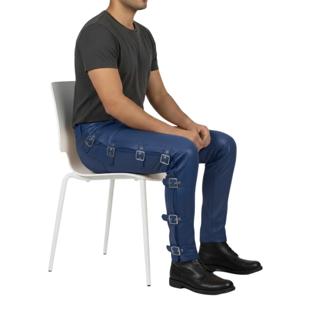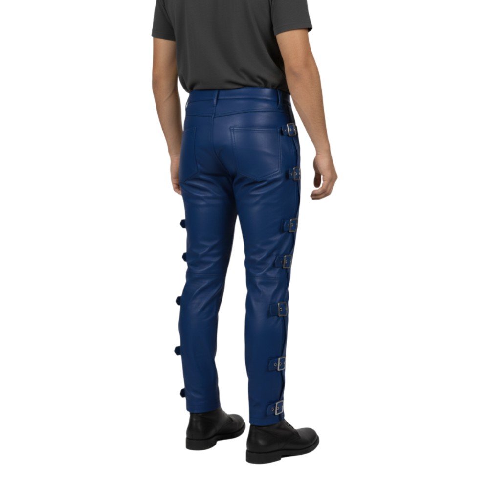 Stand out with bold fashion in these Royal Blue Leather Pants with Side Straps. Vibrant color. Strong design. Confident attitude. These pants combine modern streetwear with classic biker style.