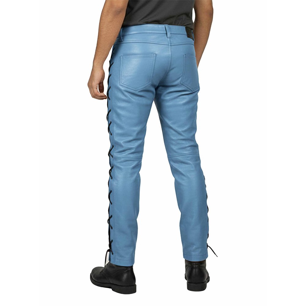 The black lace-up design sits at the front or sides, depending on the style. It adds adjustable fitting and strong visual impact. The contrast between Sky Blue leather and black laces creates a sharp, modern vibe. These pants are perfect for concerts, night outs, biker events, or bold street fashion.