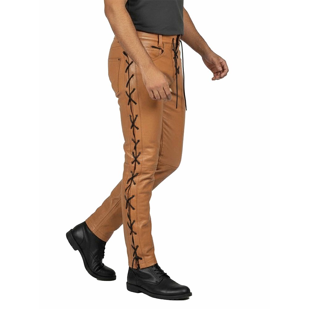 These pants are not basic fashion pieces. They are statement wear. They reflect strength, individuality, and confidence. Step out in tan leather and let the black lace-up detail speak for your bold style.