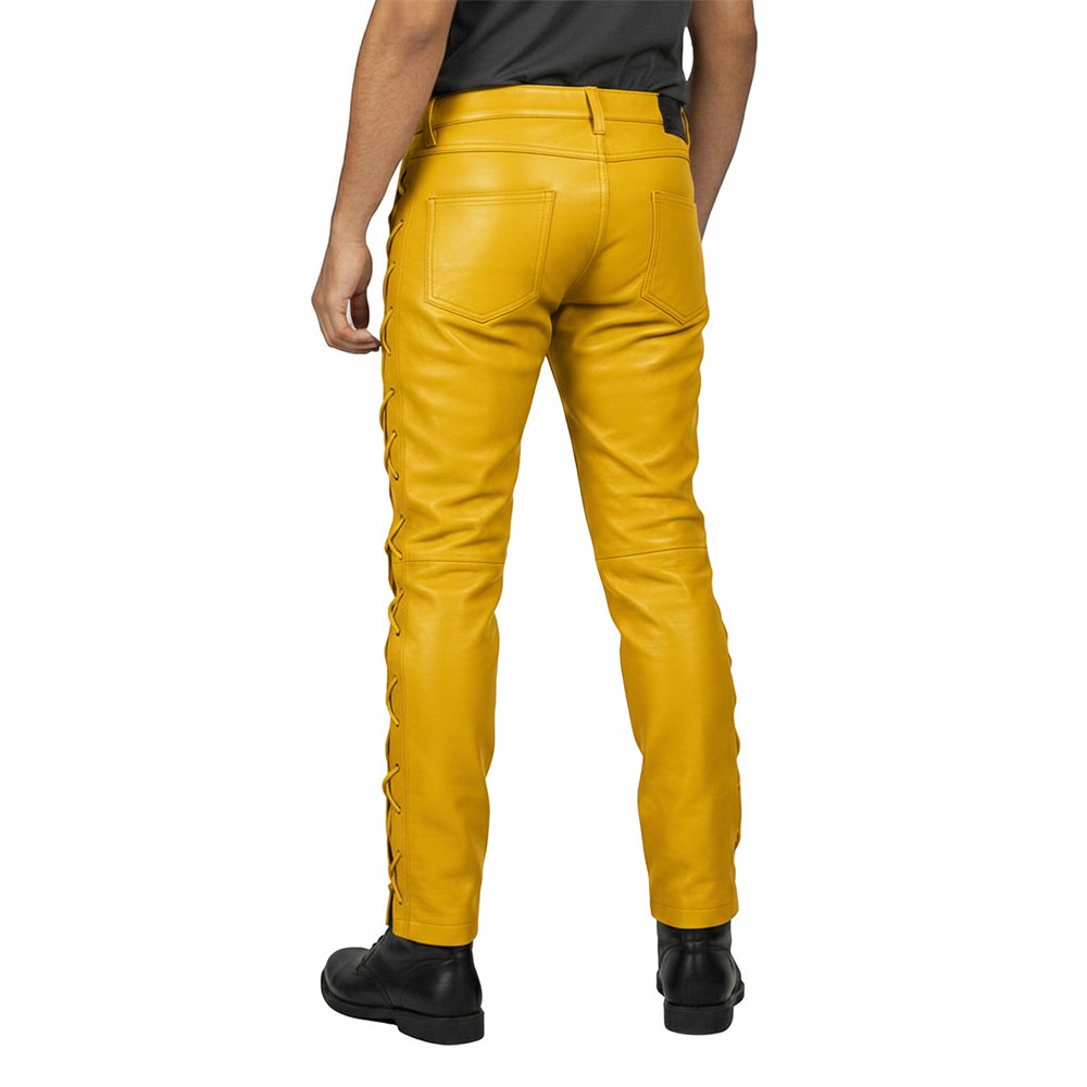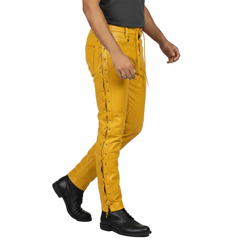 Bring fearless energy to your wardrobe with Yellow Leather Pants with Matching Side Laces. Bright colour. Clean detail. Strong attitude. These pants are made for bold personalities who love attention.